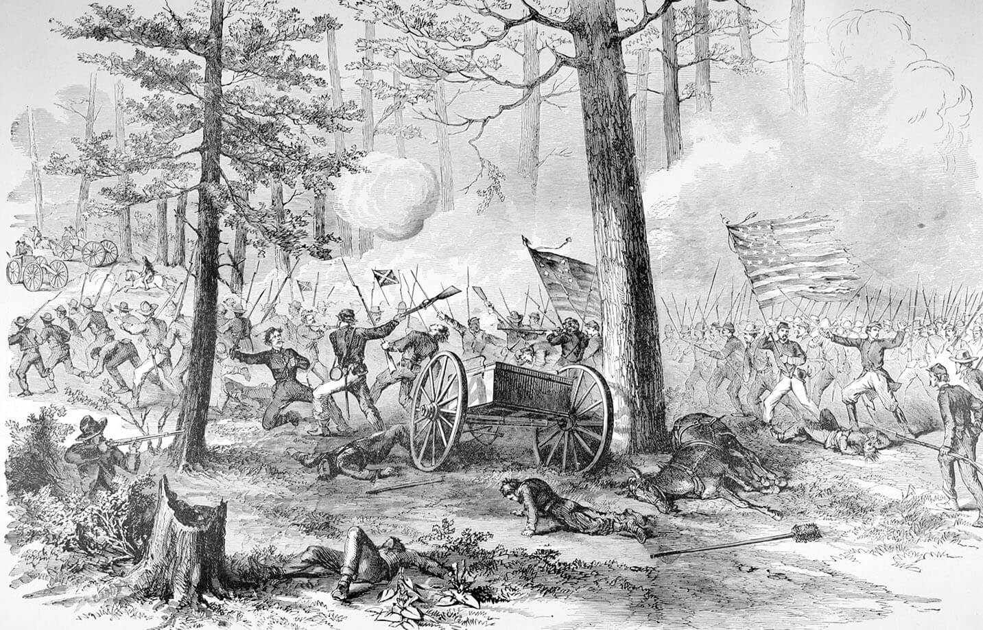 The battle has ranged over 6,000 acres of farm, woods, and swamp, leaving wreckage, burned-out woods and homes, scores of dead mules and horses, and hundreds of corpses. Some 4,000 men have been killed or wounded or have gone missing in action — in a battle neither general really wanted to fight.