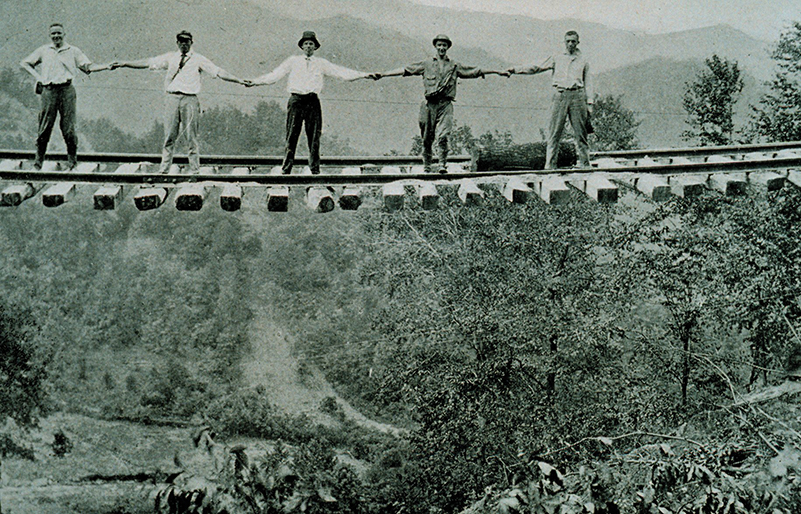 Landslides left this railroad track suspended in mid-air, but these daring men still stood on the rails for a photo. photograph by Steve Nicklas, NOS, NGS; Courtesy of National Oceanic and Atmospheric Administration/Department of Commerce
