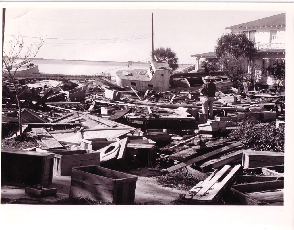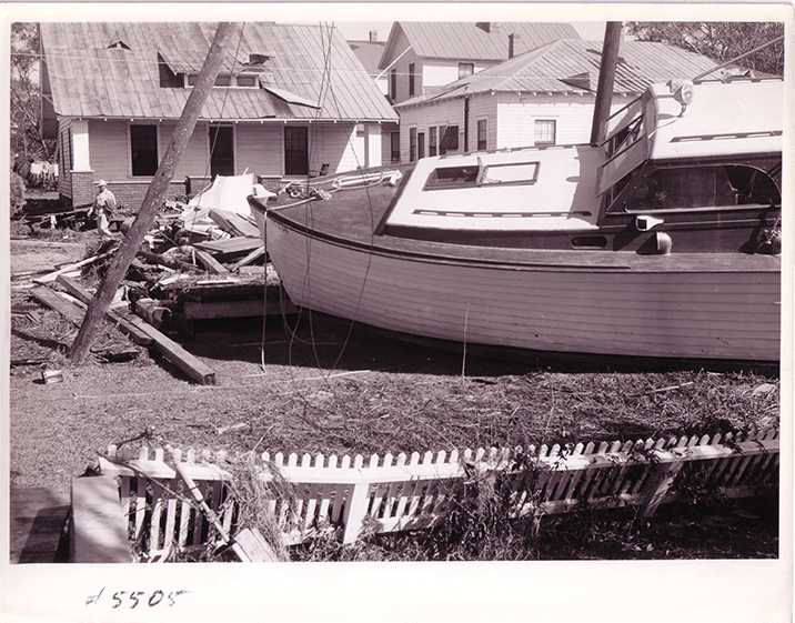With the winds and water calm once more, the people of Southport survey the damage, finding dozens of boats and yachts swept into the mainland. Every dock along the Cape Fear River is destroyed. photograph by Family Collection of Bryant Spencer