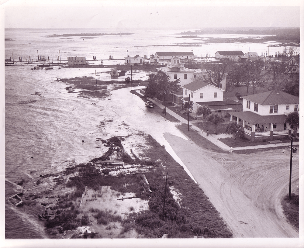 In Southport, the 15-year-old boy, Tookie Potter, is stuck in a house full of family. His grandmother doubles over crying, worried about losing her house. The boy can’t listen to it anymore. So he, with his learner’s permit, pulls the car out of the driveway and down the oyster-shell streets to see the damage. The shrimping boats are onshore; the roads are flooded, and he can see for miles out into the ocean. Long Beach (later renamed Oak Island), which usually is the land in the distance from here, is wiped out; 352 of 357 homes are gone. Potter looks up and sees clouds coming again. So he drives the car back home and parks.