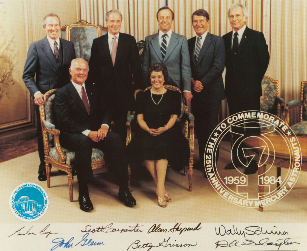 The Mercury Seven — (standing, left to right) Gordon Cooper, Scott Carpenter, Alan Shepard, Wally Schirra, and Donald “Deke” Slayton; (seated) John Glenn and Gus Grissom’s widow, Betty — were NASA’s first astronauts. They trained at Morehead before making history. photograph by North Carolina Collection, University of North Carolina Library at Chapel Hill