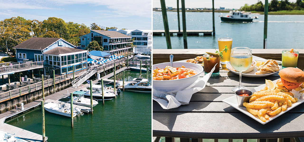 Where Mott’s Channel meets the Intracoastal Waterway, diners at Dockside enjoy a spread of shrimp and grits, littleneck clams, Spanky’s Blue Crab Dip, and a shrimpburger. photographs by Matt Ray Photography