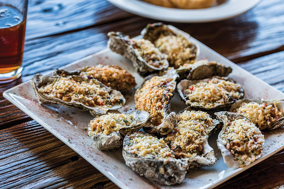 The shellfish in owner Sammy Boyd’s oysters Rockefeller arrive at Southern Salt from his aquaculture farm five miles away. photograph by Charles Harris