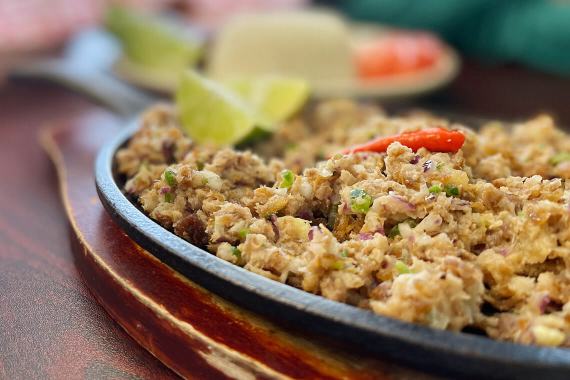 Filipino Cuisine’s most popular dish is sisig, served on a hot plate. “It’s fried pork belly, and we mince it with ginger, jalapeño, onion, and lime,” Pasion explains. “We serve it with rice and sometimes top it with an egg, extra chilis, and a slice of lime.”