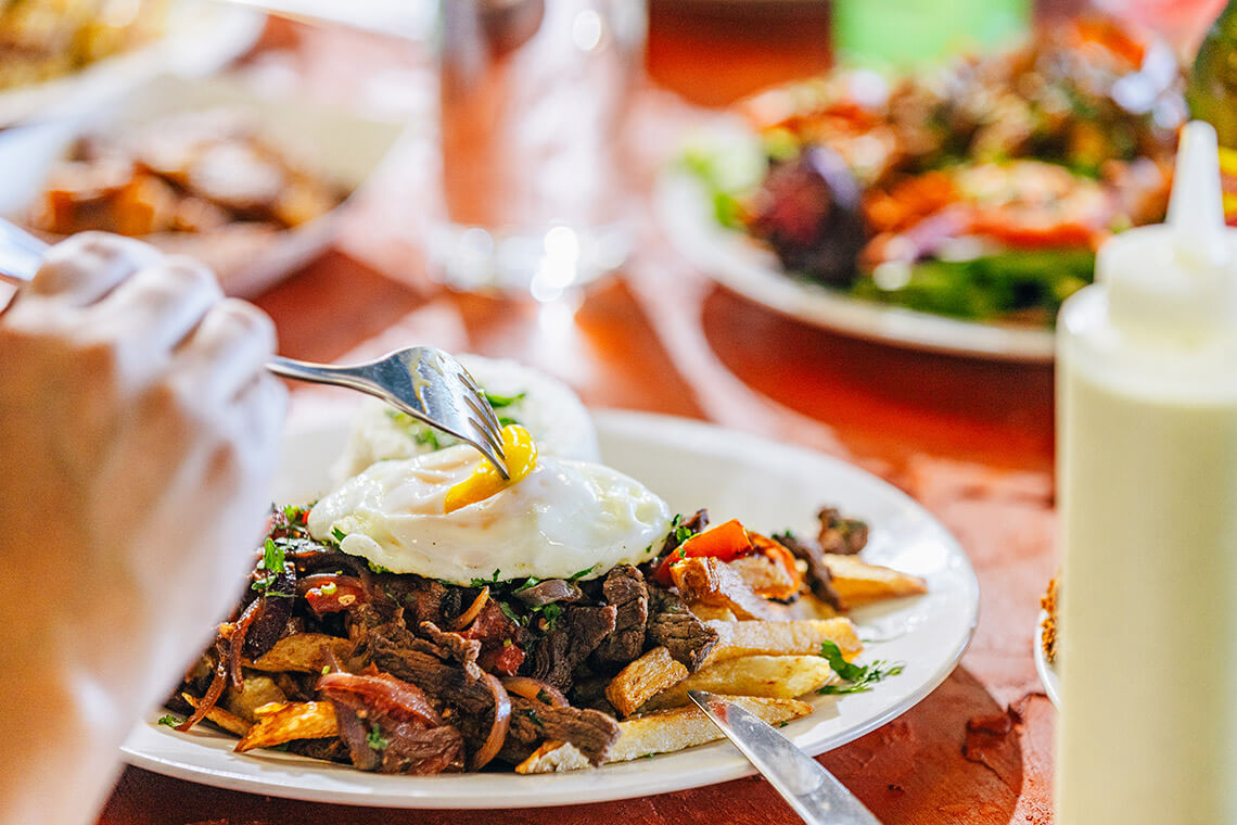 Order the lomo saltado at Pollos Tete, french fries topped with strips of sirloin, tomatoes, onions, cilantro, sauce, and a fried egg. Photography courtesy of Visit Jacksonville