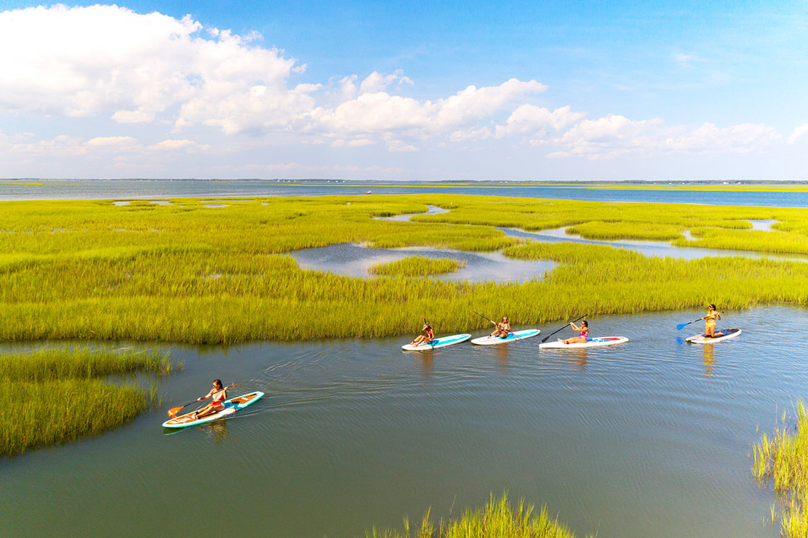 Explore the marsh islands within the Rachel Carson Reserve by standup paddleboard or, for those still mastering their balance, sightsee by kayak. Photography courtesy of The Crystal Coast