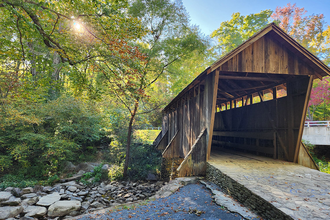 On the quarter mile wander to the covered bridge from where you’ll park your car, you’ll pass a baptismal pool, cross gentle footbridges, and walk under the boughs of hardwood trees that filter the light, dappling the ground underfoot.