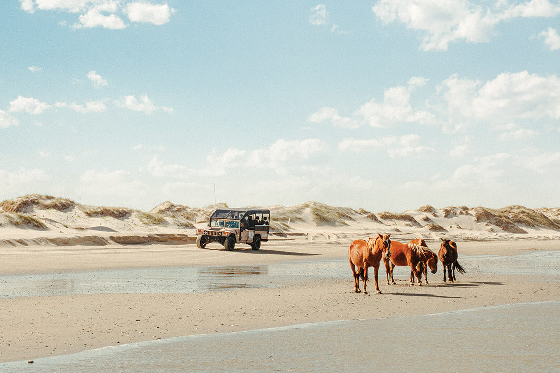 The open-air Hummers on Wild Horse Adventure Tours drive right on the beach, where wild horses are sometimes spotted at the water’s edge. Photography courtesy of COROLLA WILD HORSE TOURS
