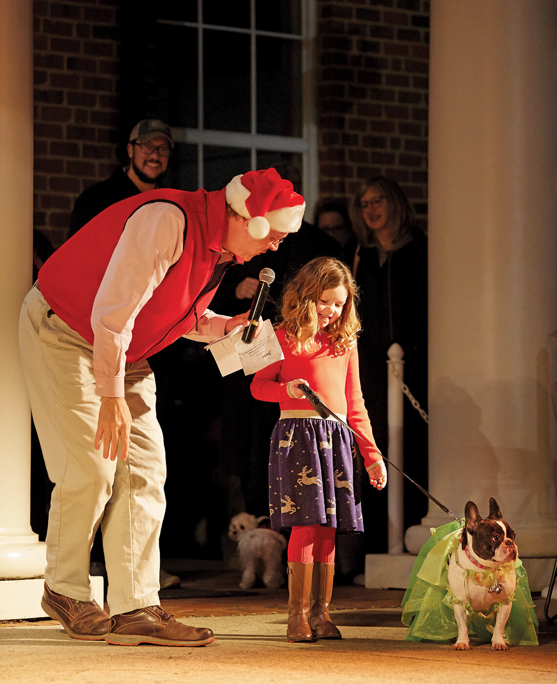 Who says a Frenchie can’t wear a tutu? Certainly not local veterinarian Dick Hay, the emcee of Christmas in Davidson’s Doggie Fashion Show, a 30-year tradition at the event. photograph by Stacey Van Berkel