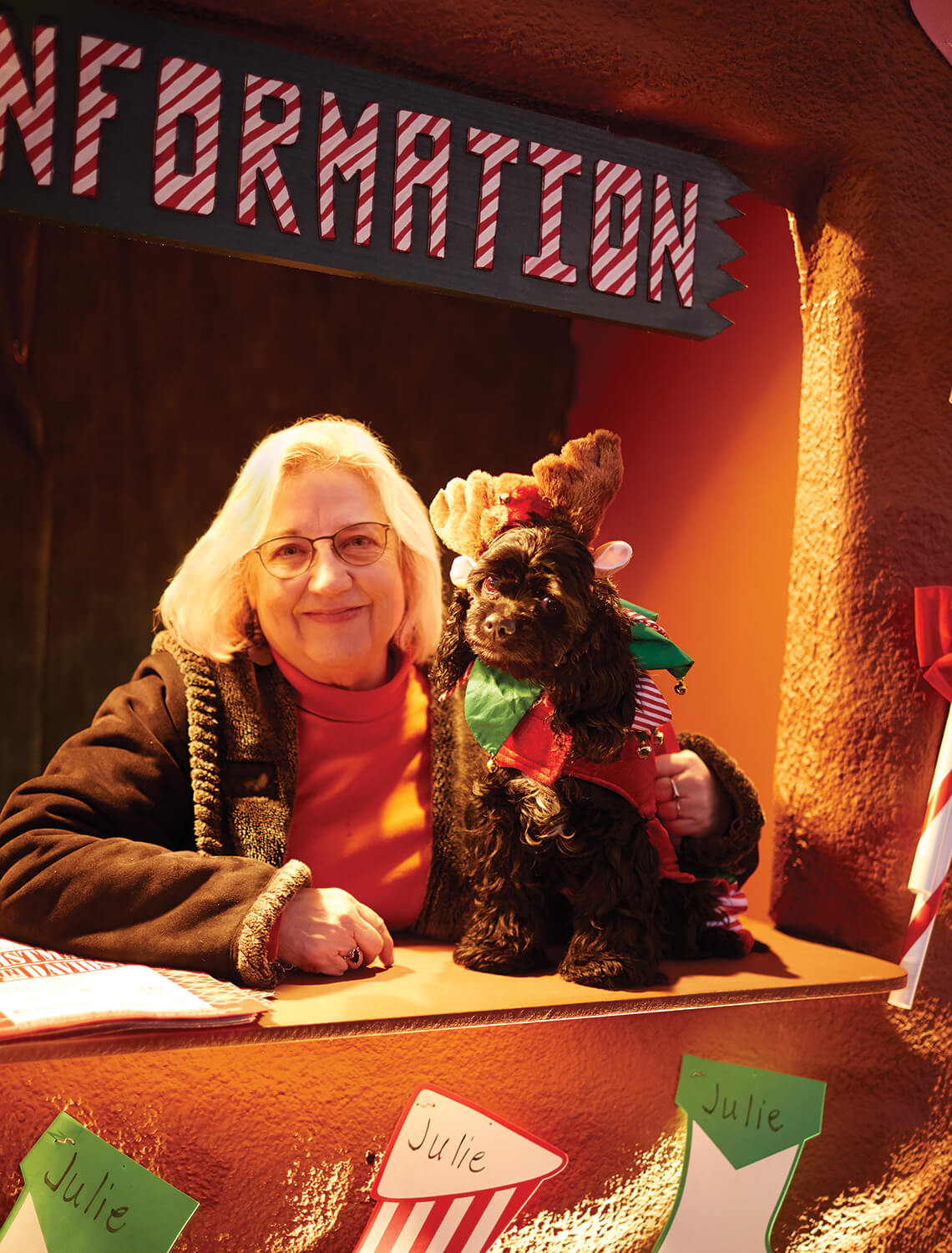 Julie Jones has worked Christmas in Davidson’s gingerbread information booth for years. But her cocker spaniel, Lovie, is the main attraction. photograph by Stacey Van Berkel