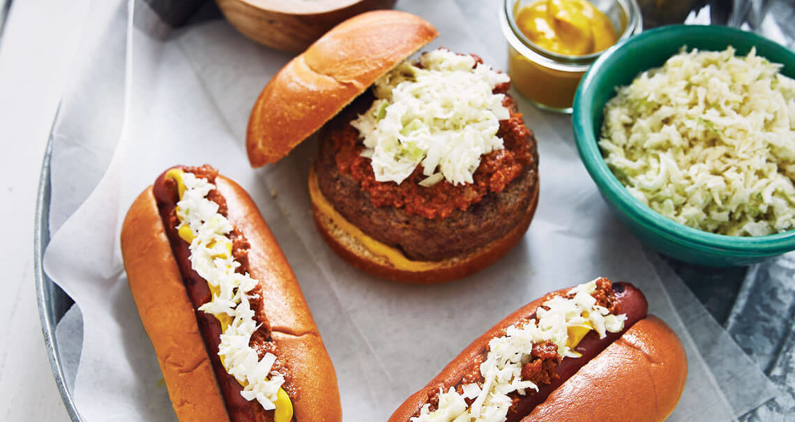 North Carolinians love a Carolina dog “all the way” — topped with chili, slaw, onions, and mustard. Nothing more, and nothing less.