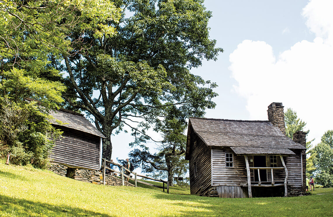 Located on what is now the Blue Ridge Parkway, Brinegar Cabin was built by Martin Brinegar and his wife, Caroline, in the 1880s. The two-room, one-anda- half-story cabin with clapboard siding, wooden shingles, two dry-stacked chimneys, and a stone foundation is a surviving example of construction methods used by early settlers in North Carolina’s remote regions. The cabin rests on what was once a 125-acre farm, where the Brinegar family maintained livestock, gardens, and an apple orchard. They grew, collected, and made the things they needed, living a nearly self-sufficient lifestyle. Caroline made the family’s clothing, weaving linsey-woolsey cloth on a four-poster handloom that had been a wedding gift from her father. Martin earned a little money as a cobbler, selling shoes for about a dollar a pair. Caroline and the children collected herbs to sell to merchants in Jefferson and Boone. Today, the cabin, cellar, springhouse, and a garden are open to visitors as an interpretive exhibit, offering a glimpse into Appalachian farm life from 1885 to 1935.