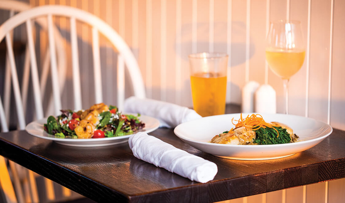 At the Lifesaving Station restaurant, guests can enjoy dishes like spring mix salad with shrimp and goat cheese or seared scallops with charred broccolini.<br><span class="photographer">photograph by Chris Hannant</span>