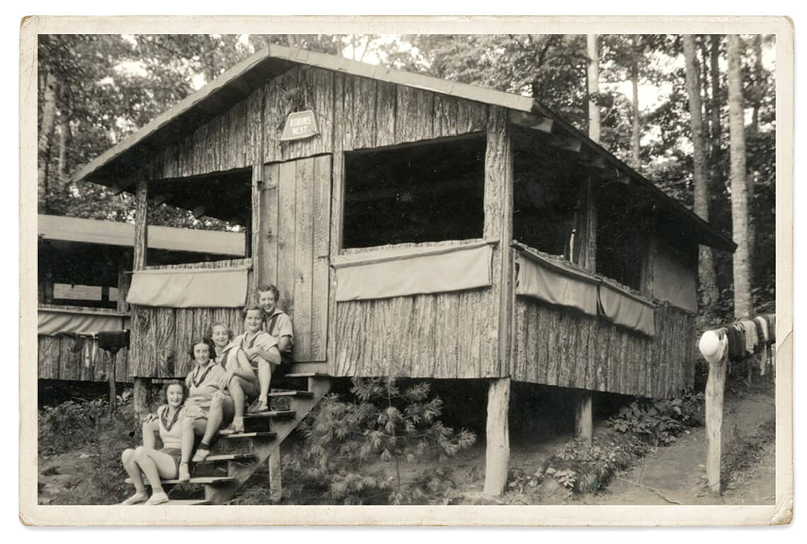 Camp Merrie-Woode, at the base of Bald Rock Mountain in Sapphire Valley, was established as Lake Fairfield Camp in 1919, amid a national movement that saw increased outdoor recreation and education opportunities for girls. As more women matriculated into colleges and universities and fought for their right to vote, camp directors strove to instill in young women self-reliance and strong character. The oldest of Merrie-Woode’s Adirondack-style cabins date from 1919 to 1922, and they continue to shelter adventure-seeking girls and young women each summer.