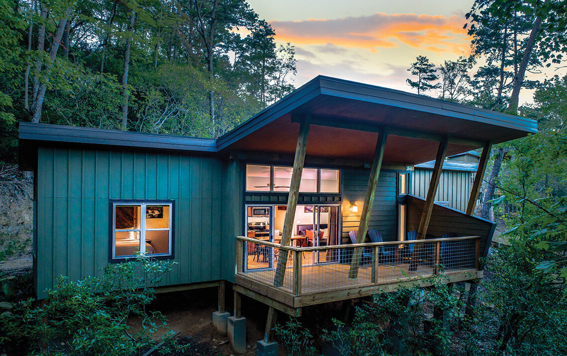 Sitting on 132 acres, Pilot Cove offers luxury cabin rentals that cater, in part, to outdoor recreation enthusiasts drawn by neighboring Pisgah National Forest. Expert mountain bikers can find speed and hit jumps on a closed-loop mountain biking track — equally suited for beginners who prefer to keep both wheels on the ground. At the end of the day, after kicking off hiking boots or fishing waders in the cabins’ mudrooms, guests can convene around a firepit while watching the sun dip behind the mountains at Sunset Point, or wheel a locally made live-edge kitchen table out to a private deck for an al fresco dinner among the trees.