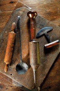 In the log cabin and outbuildings at the Zebulon B. Vance Birthplace, visitors can see 19th-century kitchen implements like a sausage stuffer and a chopper. photograph by Tim Robison