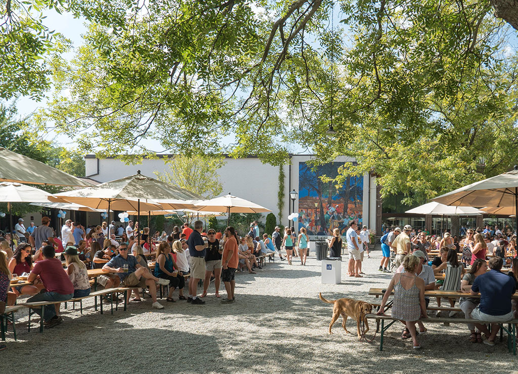 Even Fido is welcome to enjoy the pecan, hickory, and oak trees spread out across The Olde Mecklenburg Brewery’s Biergarten. photograph by The Olde Mecklenburg Brewery