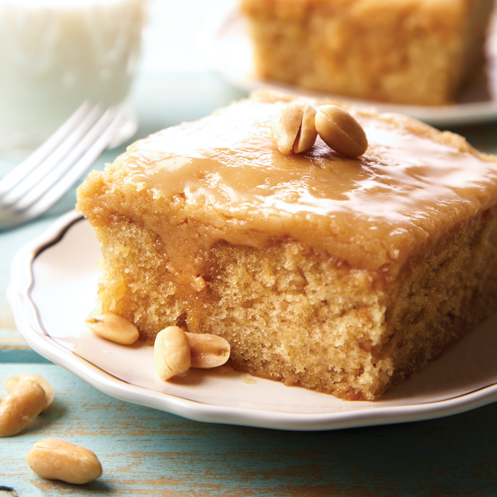 To make the frosting, bring butter, peanut butter, and buttermilk to a rapid boil. Remove from heat and gradually whisk in vanilla and powdered sugar. While the frosting is still hot, spread over the warm cake. Let cake cool completely and cut into bars.