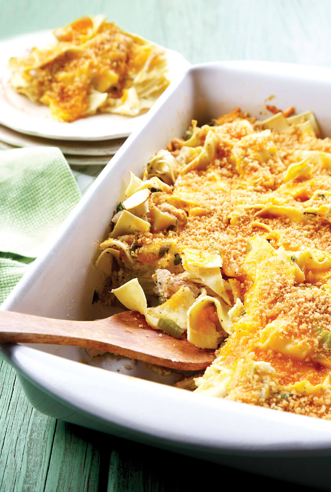 Melt remaining 2 tablespoons butter and mix with bread crumbs. Sprinkle cheese over casserole and top with bread crumbs. Bake for 45 minutes or until the casserole is bubbly around the edges.