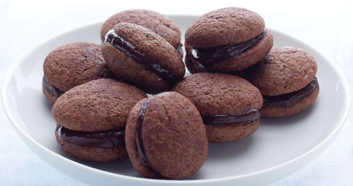To finish the cookies, divide and spread the filling equally onto the bottoms of half of the cookies. Top with the plain cookies to create sandwiches.