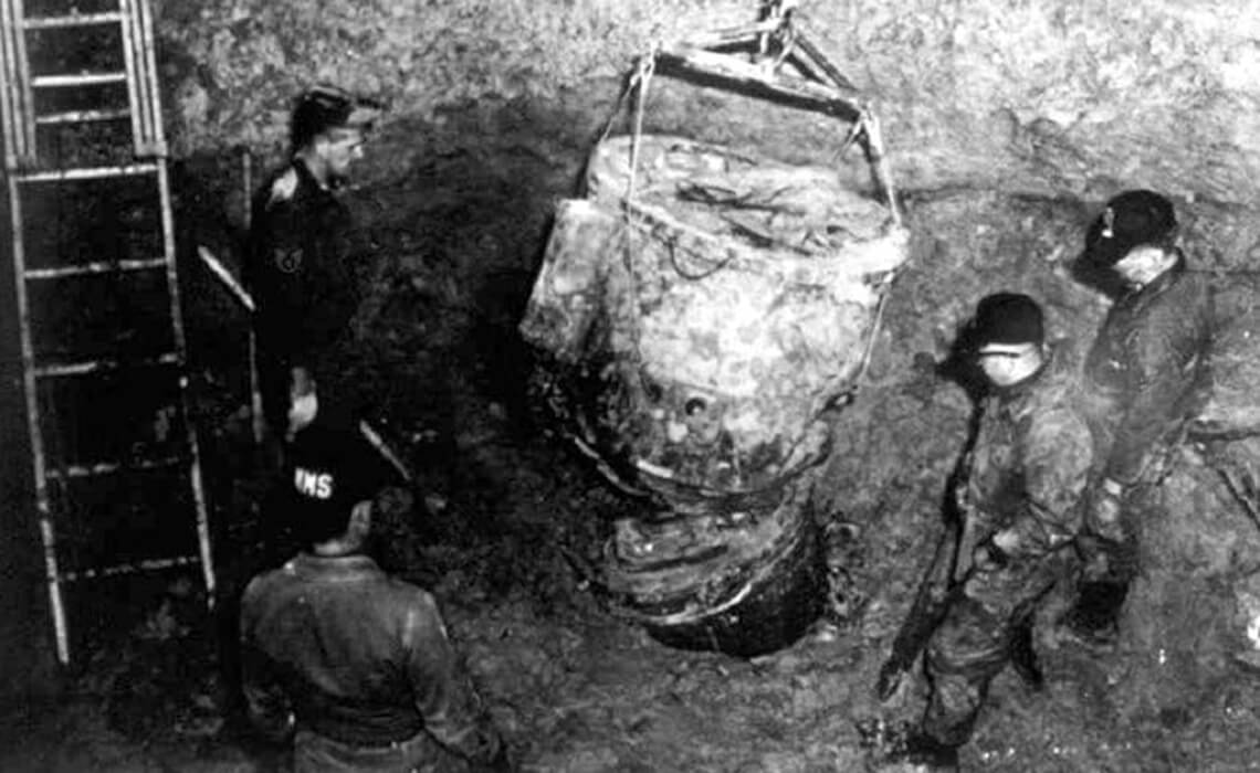 With his crew — nicknamed the Terrible Ten — he finds the first bomb intact. “Once we determined it was safe to handle, we used the crane to tip it over and put it on the back of a flatbed truck.” But the second bomb presents a problem, as ReVelle recalls: “This huge, multi-ton weapon penetrated the ground at 700 miles an hour and buried itself in the swamp.”