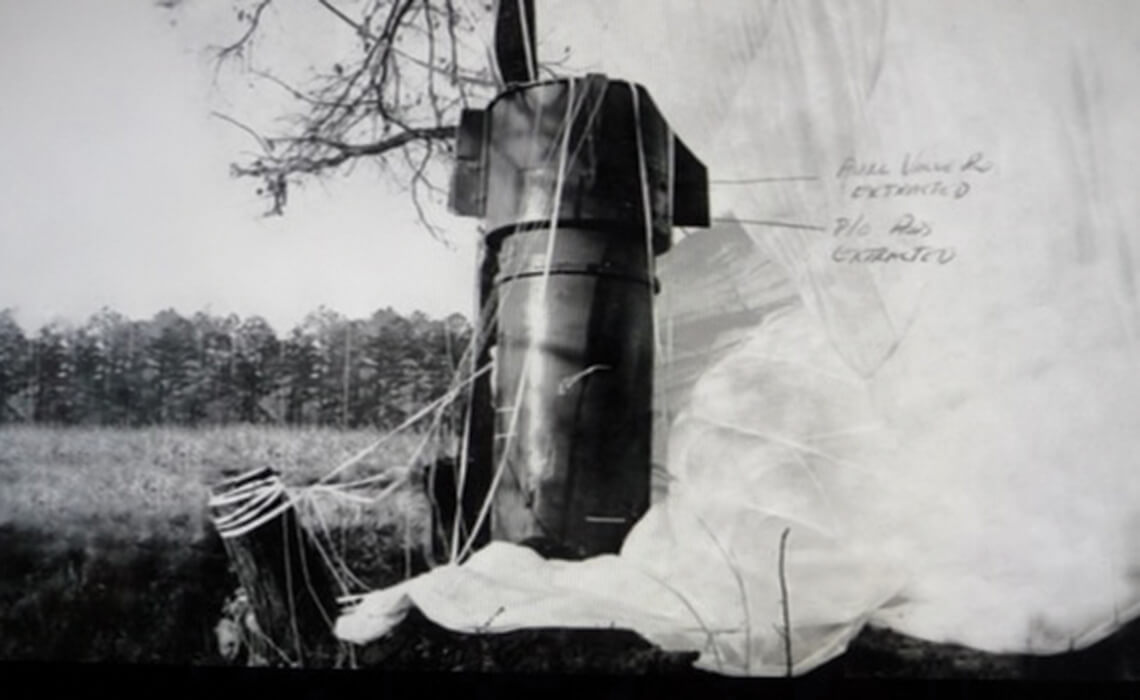 As the plane tailspins to earth, somewhere between 9,000 and 7,000 feet, the first bomb positioned in the aft bomb bay door is released and parachutes to earth a mile ahead of the crash site, 15 miles northeast of Goldsboro near Faro. Its parachute snags on some trees, and the projectile lands upright, its nose buried 18 inches in the soil. As a classified analysis by the Sandia Corporation determines, the second bomb is released through the forward bomb bay door between 5,000 and 2,000 feet. Its parachute fails to open, and it strikes the ground, blasting an eight-foot-wide crater. The “secondary subassembly,” containing enriched uranium, buries itself deep in the soft bog of a field verging Nahunta Swamp.