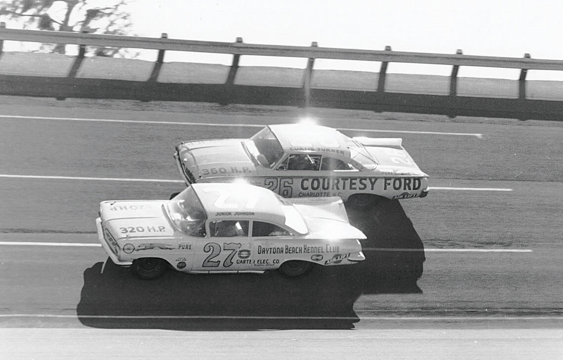 At the Daytona 500 on February 14, 1960, Johnson, No. 27, ducked around Curtis Turner, No. 26, and ultimately won the four-hour race. photograph by RacingOne/ISC Archives/Getty Images