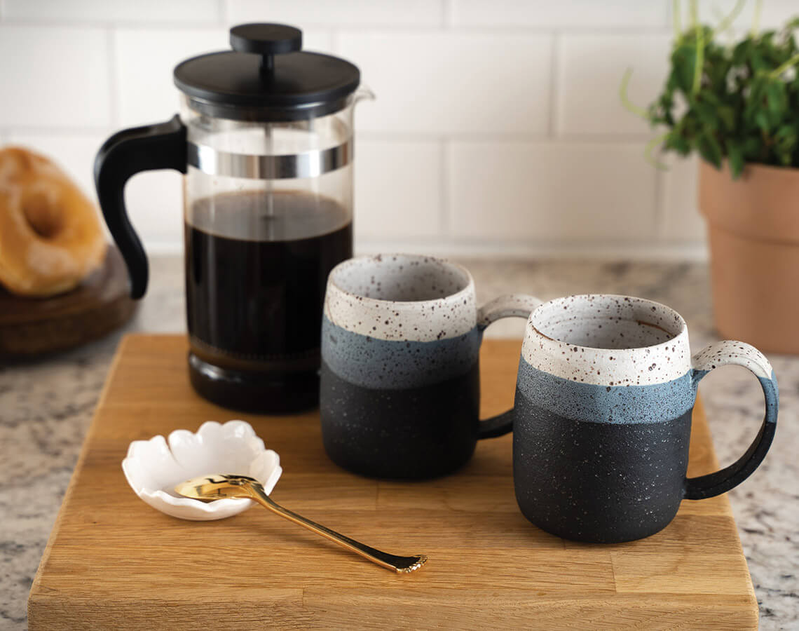 Tiny Hands Pottery’s Blue Ridge Parkway collection features a matte finish in mountain hues. photograph by PAUL SHERAR, STYLED BY STYLE BY EPOCH