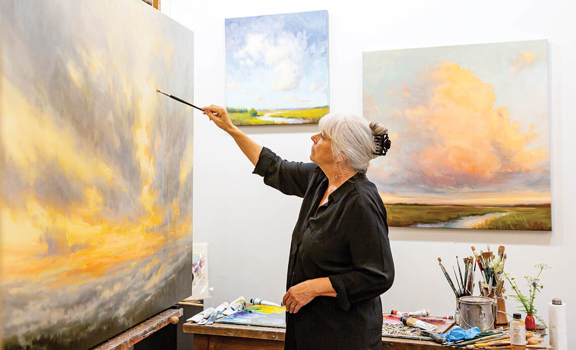 Jo Ridge Kelley’s paintings often capture the beauty of the sky. She’s drawn to the way sunlight illuminates the clouds and mist settles into the mountains. photograph by Tim Robison