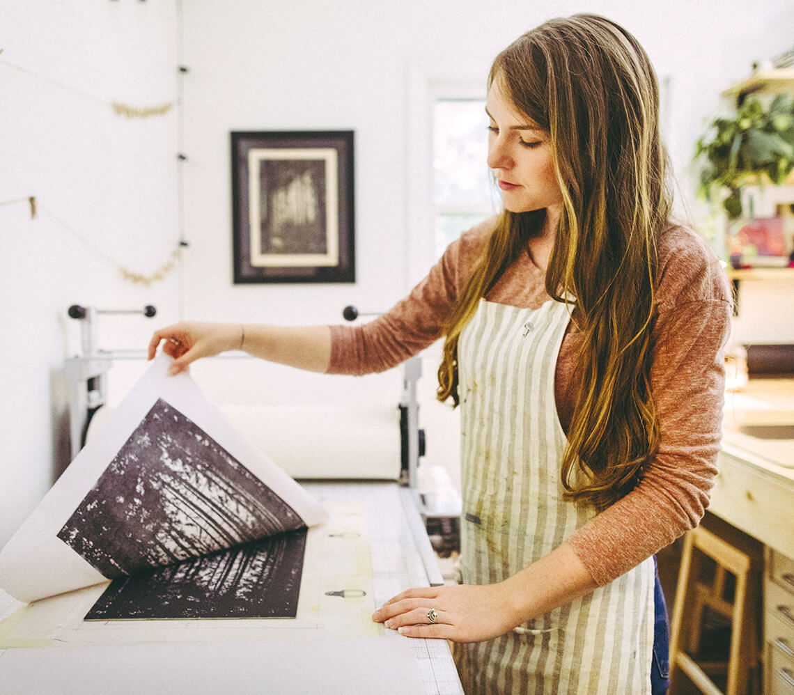 Lauren Crowe usually carves four to seven separate wooden panels that she then inks and layers to create a single image. The process can take several weeks to complete. photograph by The White Crowe