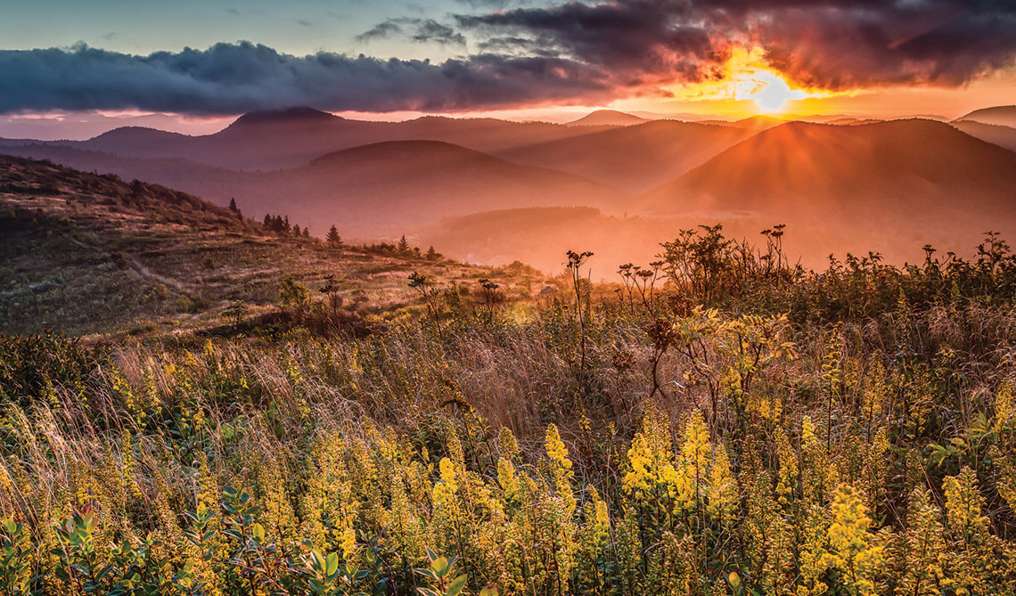When sunlight bathes the mountainsides in a glow different from the day before, a new season is alive along the Blue Ridge Parkway. With canvas and oil paints in hand, Jo Ridge Kelley heads out to capture it. She usually sets up her canvas right in the middle of the landscape so that she can be among the hazy mist, crisp colors, and striking mountains that she’s painting. The key threads running through Kelley’s work are her use of bright colors in the foreground and her focus on the sky. “I just love watching how the sky and clouds interact with the mountains, and I love trying to capture that,” she says. In her gallery in downtown Waynesville, Kelley’s vibrant images of the Blue Ridge Parkway line the walls. Twice a year, she hosts a landscape painting workshop, sharing her process with a small group and taking them into nature to find pops of color and light. — Anna Mudd