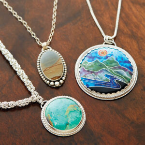 Diane, Lou, and Maggie Morrison use recycled metals and engraved stones to capture mountain landscapes in their jewelry. photograph by Stacey Van Berkel
