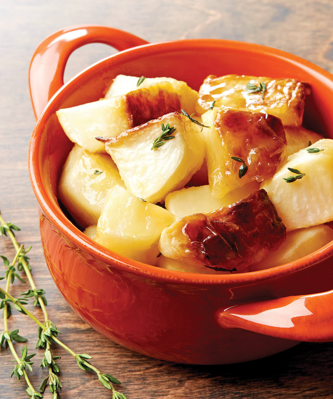 Arrange turnips in a single layer and roast for 20 to 30 minutes, turning over halfway through cooking time. Garnish with fresh thyme sprigs.