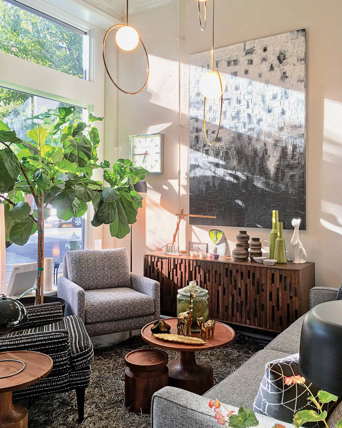 This mid-century modern home showroom sells trendy, covetable furnishings, including sofas, rugs, light fixtures, original pieces crafted by local woodworkers, and even pillows designed by former store owner Bob Drake.