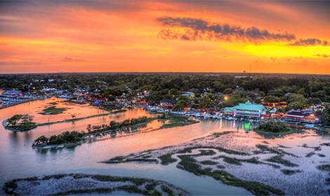 Just 20 minutes south of Myrtle Beach, Murrells Inlet’s MarshWalk snakes a half-mile along the natural saltwater estuary. The route is lined with restaurants and tiki bars — each boasting exceptional water views — earning the MarshWalk’s reputation as the place to go for date nights, family dinners, and live music.