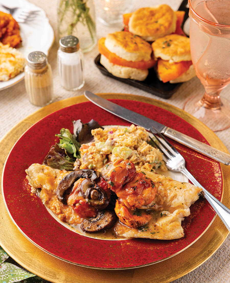 Anderson loves to dream up different ways to showcase the Smokies’ famous fish. One night, she might offer trout marsala with chicken of the woods mushrooms, served with cornbread salad and tomato biscuits. photograph by Tim Robison