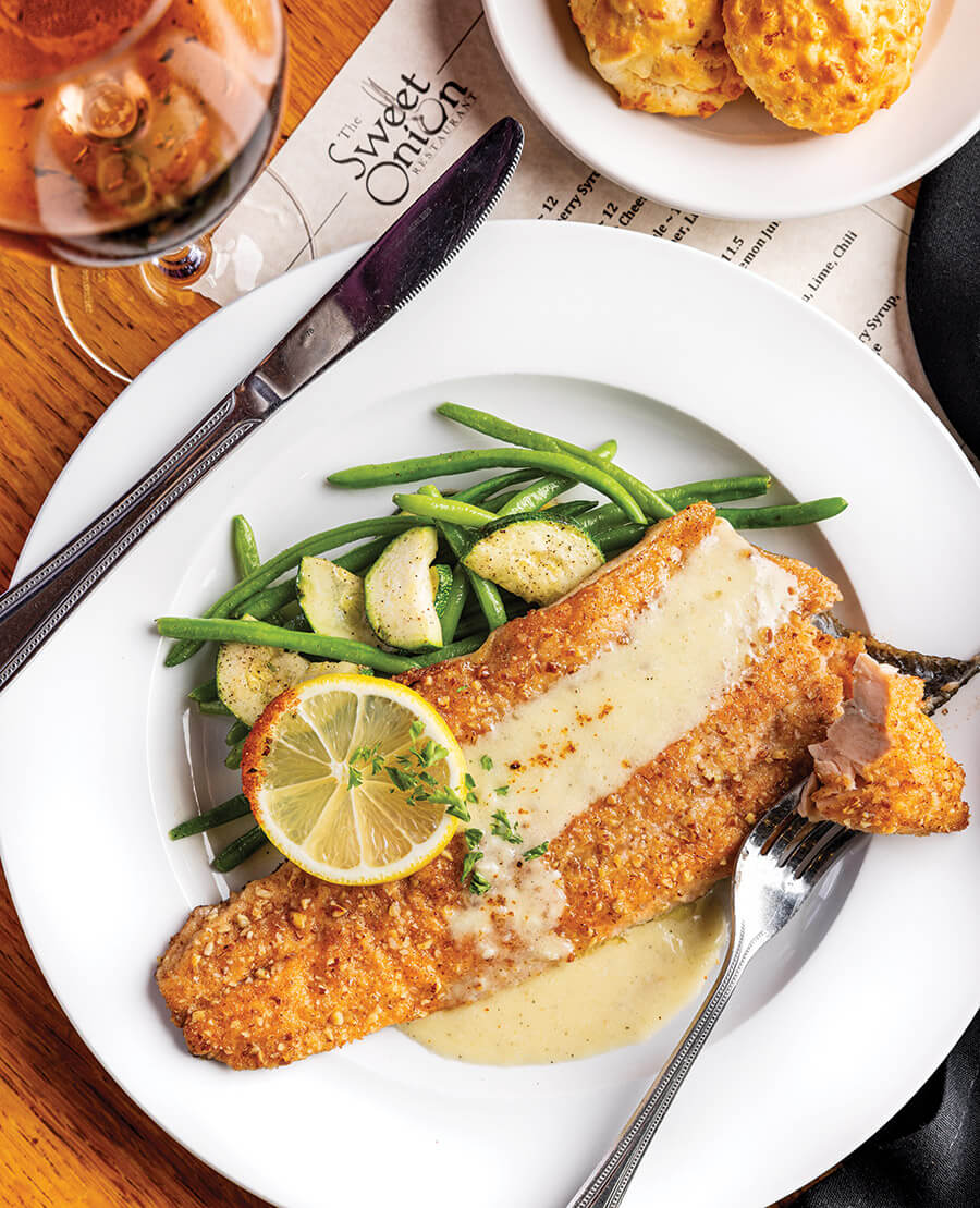 Twice a week, Sunburst Trout Farms delivers fresh fish to Sweet Onion Restaurant, where it’s pan-seared, enveloped in a pecan crust, drizzled with lemon-garlic sauce, and served with your choice of side. photograph by Tim Robison