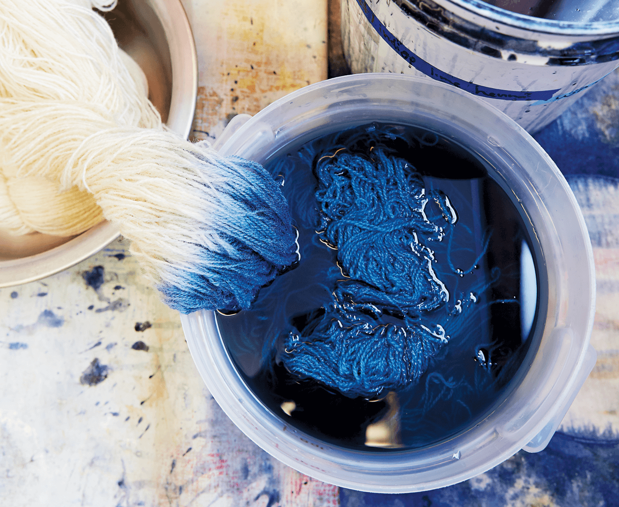 Spicer dipped her wool warp in an indigo vat. The brilliant blue dye is a product of fermentation. photograph by Stacey Van Berkel