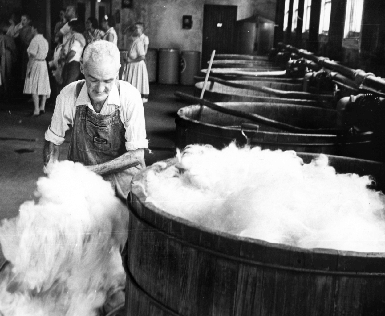 White wool imported from Australia and New Zealand was cleaned, then dyed in sturdy cypress vats. Biltmore Industries employees stirred the loose wool constantly to ensure that the color was evenly distributed. photograph by Grovewood Village and D.H. Ramsey Library, UNC Asheville