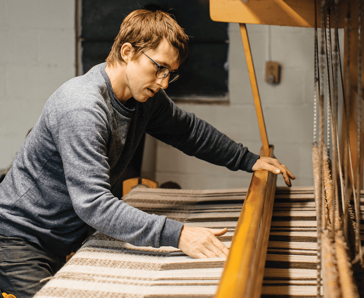 Michael Montagne’s studio holds several looms in different sizes, including one his mother got before Michael was born 35 years ago. It takes 10 to 12 weeks for him to weave a rug — one line at a time. photograph by Stacey Van Berkel