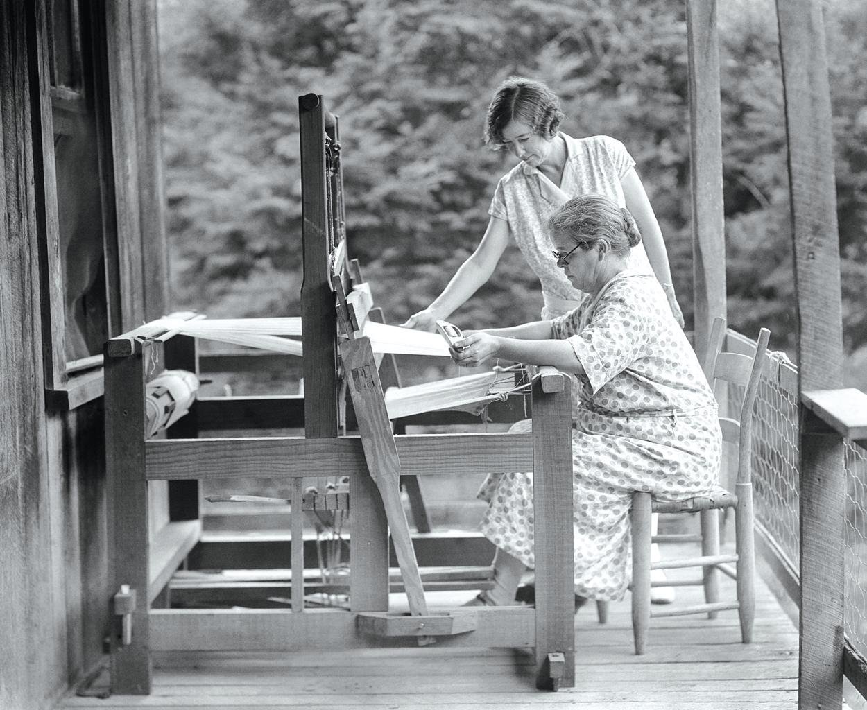 In the 1930s, Lucy Morgan (left) shared her knowledge of weaving with local women like Minnie Hoppes. Today, that tradition continues. photograph by The Bayard Morgan Wootten Photographic Collection #P0011, North Carolina Collection, Wilson Library, UNC Chapel Hill