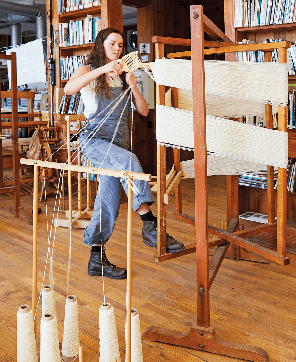 One of the first steps of weaving cloth is “winding the warp,” or measuring and organizing the threads that run lengthwise on a loom. Anastatia Spicer uses a warping mill: “It’s one of my favorite tools because it’s kind of like a dance,” she says. photograph by Stacey Van Berkel