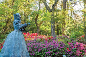 Coral bells and hoary azaleas reflect the blooms surrounding the Elizabethan Gardens’ statue of Queen Elizabeth I. photograph by Stacey Van Berkel