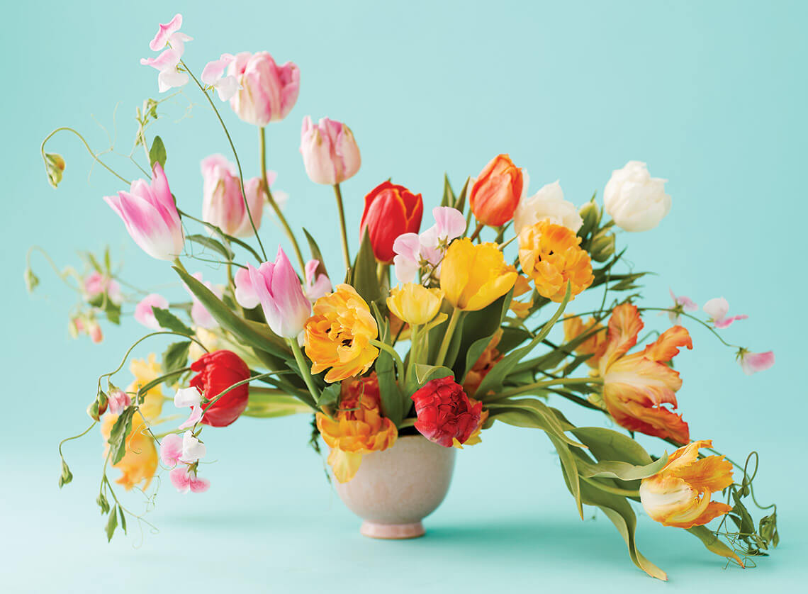 With names like Abba and Orange Princess, these stately tulips — and the delicate sweet peas that accompany them — mirror the colors of a spring sunset. photograph by Stacey Van Berkel