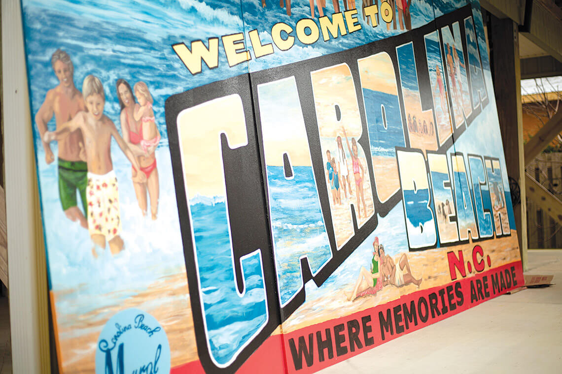 More than 50 volunteers ages 5 to 87 helped artist Susan Nuttall create Welcome to Carolina Beach — a colorful, 16-by-32-foot postcard that stands in front of Carolina Beach Town Hall. The mural is one of five that the nonprofit Carolina Beach Mural Project has completed so far. Maureen Lewis, founder and president of the organization, says, “We thought if we could tell stories about our town, it would add another dimension to people’s visit here.”