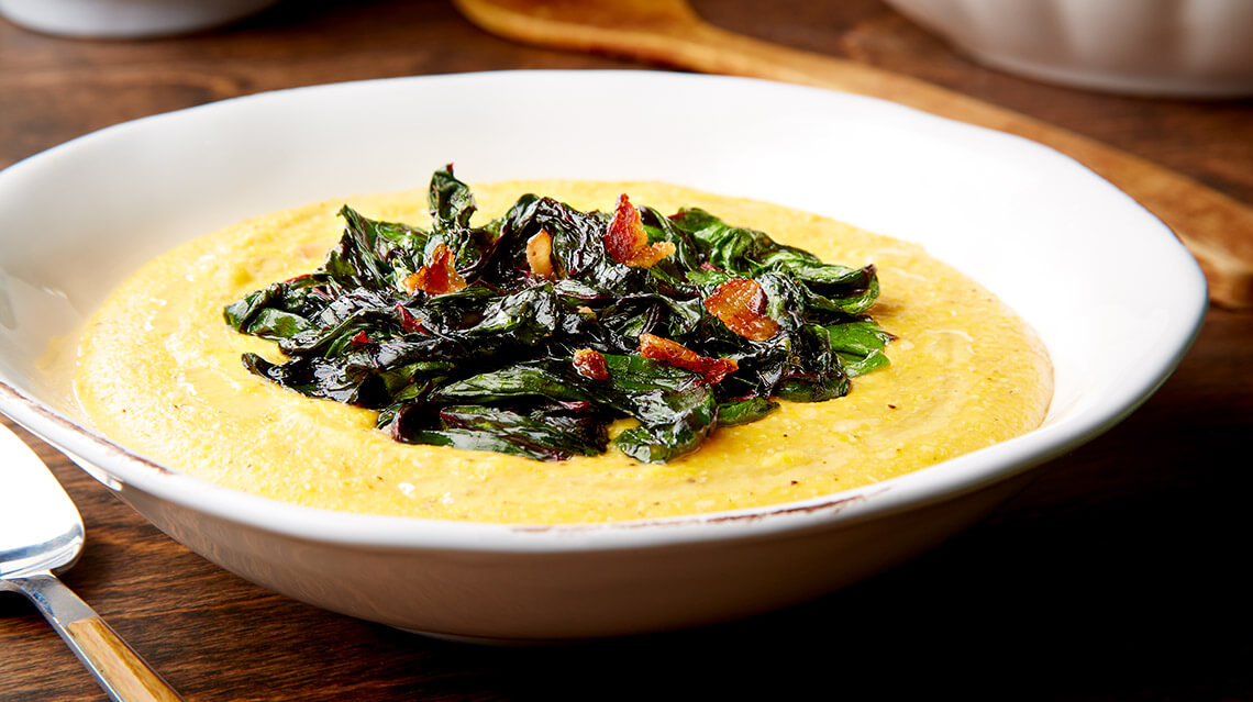 To serve, place the grits in a large serving bowl or individual bowls and top with cooked greens in center of grits. Drizzle with olive oil just before serving.