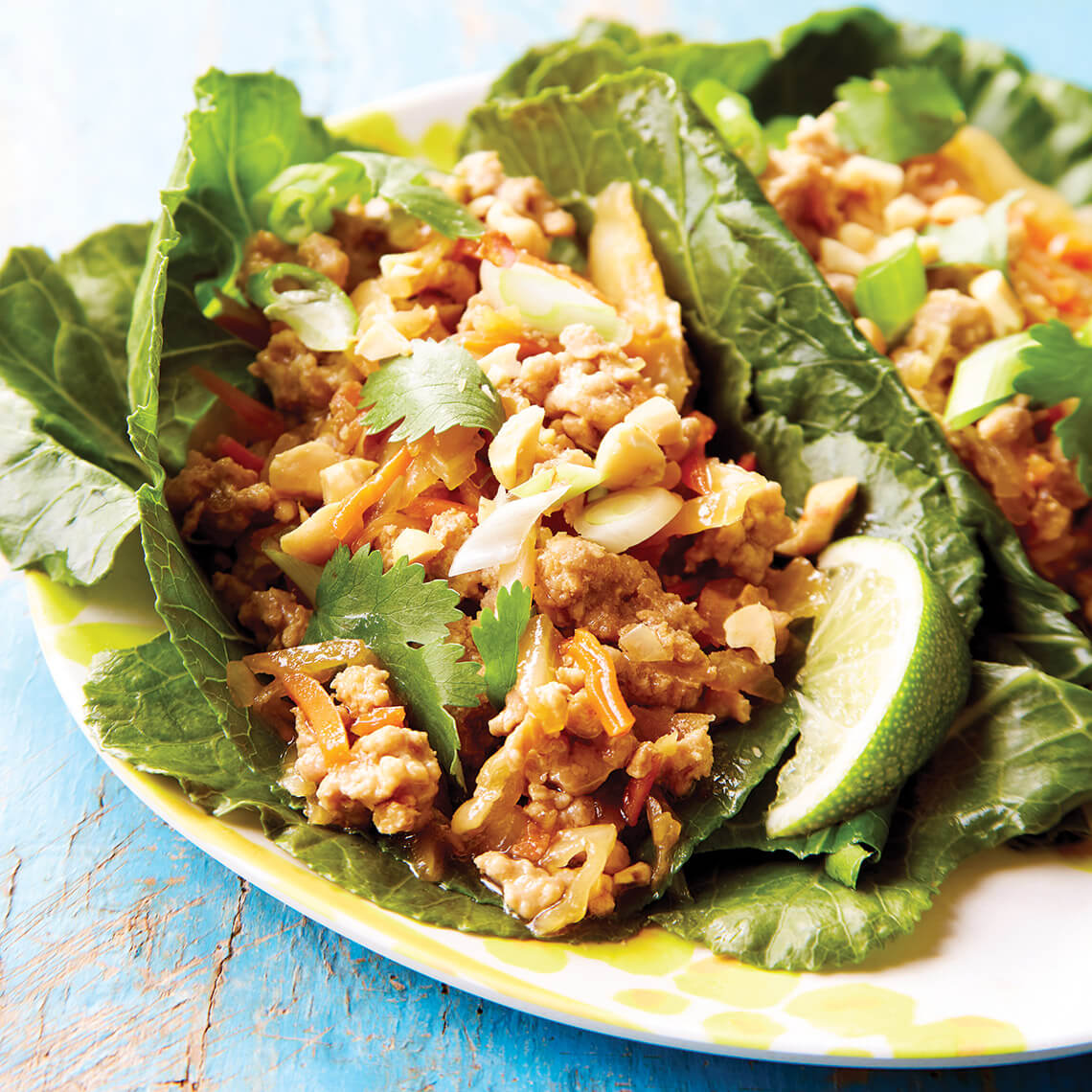 Spoon approximately ¼ cup of ground pork mixture into center of each collard leaf. You may need to use two leaves overlapping, depending on size. Add toppings as desired. Fold ends of collard leaves over the pork mixture and roll tightly. Serve warm.