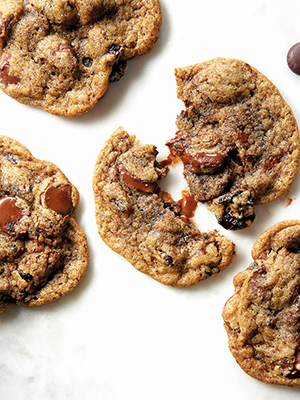 Beat in flour mixture, then stir in chocolate morsels and cherries. Drop dough by rounded teaspoons onto a parchment-lined cookie sheet. Bake for 10 to 12 minutes or until cookie edges are slightly browned and the centers are slightly soft. Dust cookies with remaining espresso powder. Cool on wire rack.