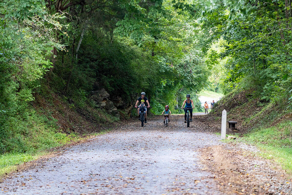 The Tweetsie Trail draws cyclists, runners, and casual walkers to its natural setting that’s peppered with pieces of local history along its 9.6-mile route, from the original railroad depot to the Sabine Hill State Historic Site. Photography courtesy of Carter County Tourism