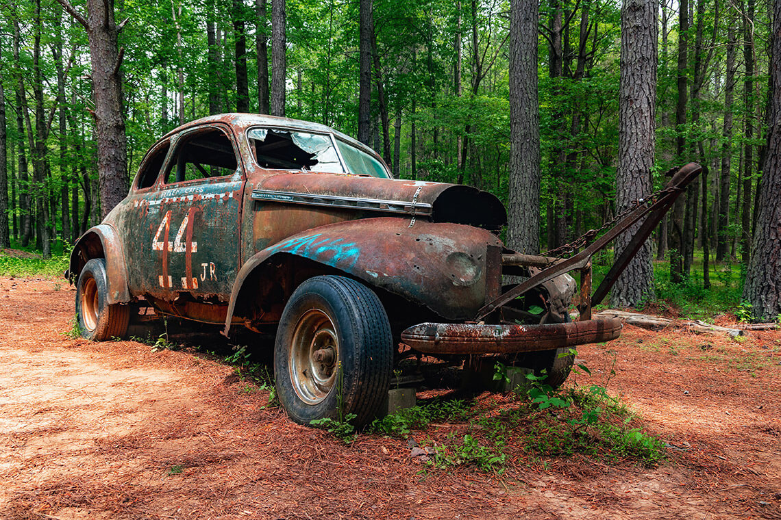 Local racer Herbert Cates drove this 1940 Chevy Coupe Super Deluxe at the nearby Jalopy Speedway. Now, it sits along the front stretch of the Occoneechee Trail.<br><span class="photographer">photograph by Craig West/NC DNCR</span>